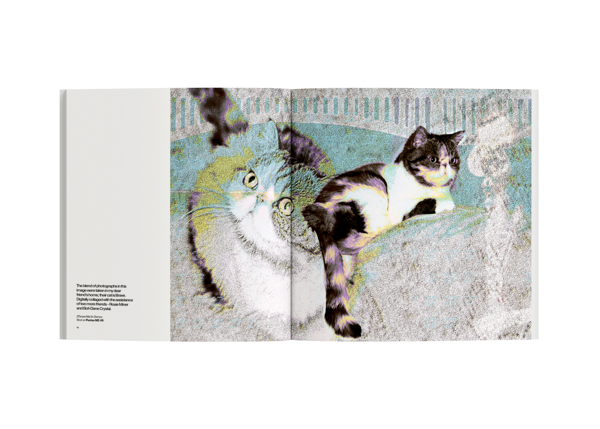 In their hands, film becomes a playground. A hand-sewn soft toy. Circuitboard fragments. A cat named Brave. Childhood objects pulled into the present tense — then digitally remixed into layered, collaged images that sit somewhere between memory, friendship, and future-noise.