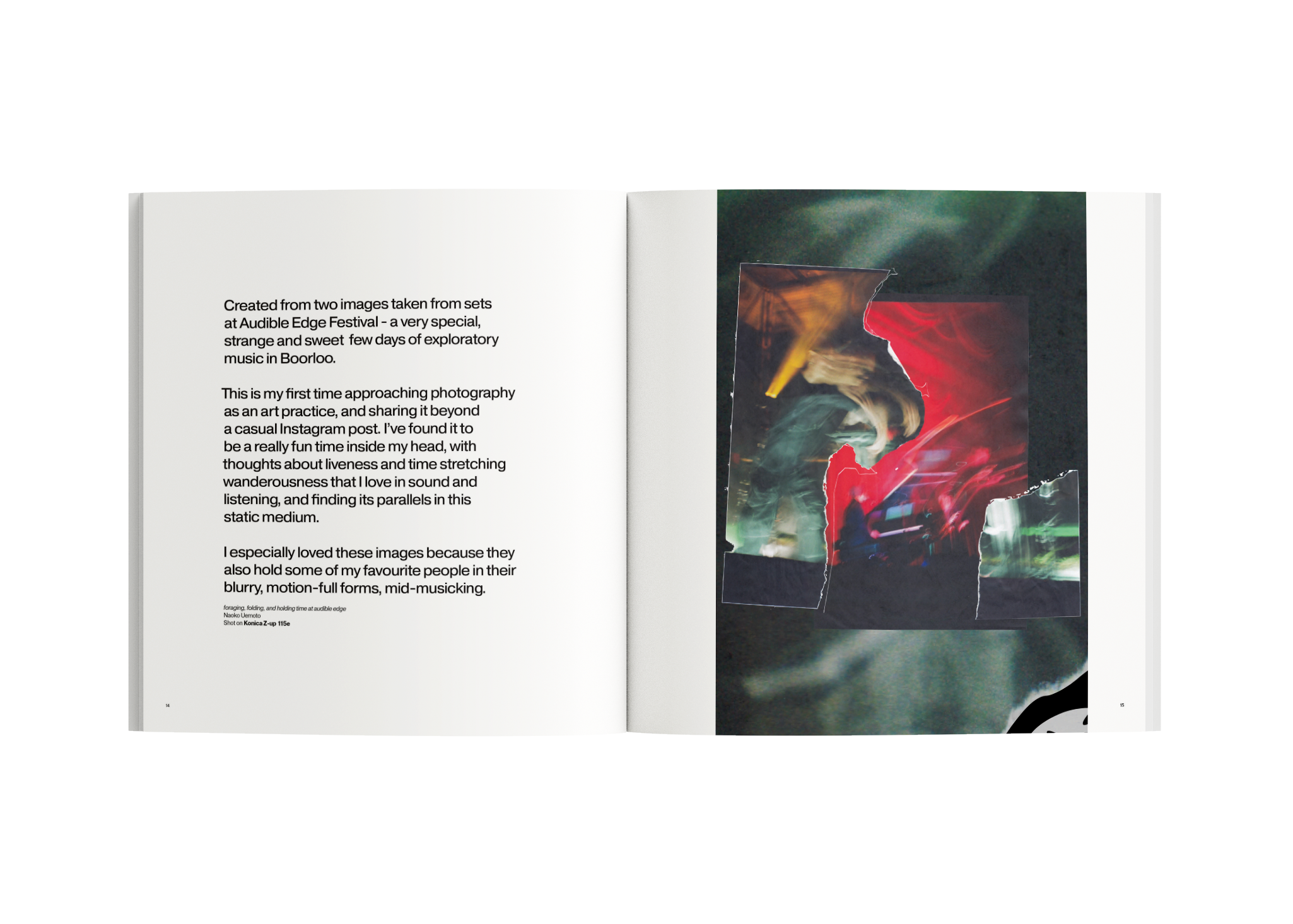 The work is created from two images taken at Audible Edge Festival — “a very special, strange and sweet few days of exploratory music in boorloo.” It’s also her first time approaching photography as an art practice, and sharing it beyond a casual Instagram post.